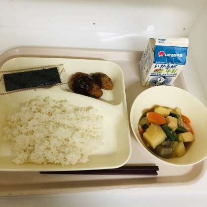 今日の献立は、ご飯、牛乳、みそカツ、じゃがいもと野菜の煮物、焼きのりでした。