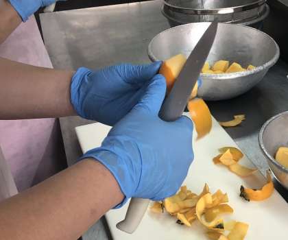 デザートの柿は、種なし柿の一種である平核無柿です。一切れずつ皮をむいて食べやすくしています。