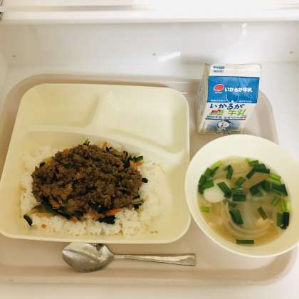 ビビンバのひき肉にカレー粉を加えて変化をつけています。新しい献立でしたが子どもたちに好評で、どのクラスもよく食べていました。