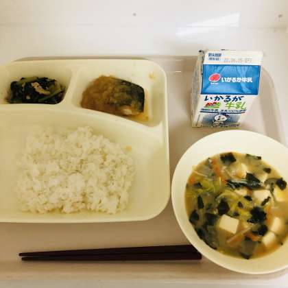 今日の献立は、ご飯、牛乳、さばのみぞれかけ、みそ汁、小松菜の煮びたしでした。