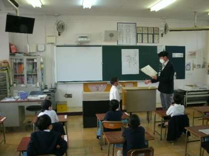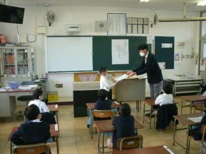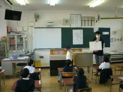 今日も児童朝会が放送で行われました。校長先生から、先日6日(日)のPTA主催の地域清掃での児童が参加したことのお礼がありました。また、消防署が主催した絵画コンクールで、1年生の児童が入賞したので、その報告があり、教室で表彰伝達を行いました。初めての表彰なので、受け取り方などを教わりました。頑張ったことに対するお友達の拍手がありました。