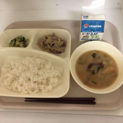 今日の献立は、ご飯、牛乳、豚肉のしょうが焼き、さつまいものみそ汁、菊菜と白菜のごまあえでした。