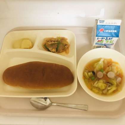今日の献立は、黒糖パン、牛乳、鶏肉のバーベキューソテー、ウインナーとキャベツのスープ、焼きじゃがでした。