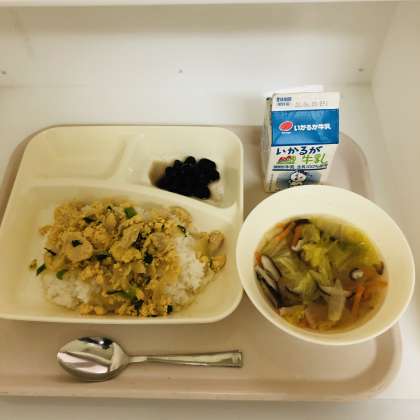 今日の献立は、牛乳、親子丼、すまし汁、黒豆の煮物でした。