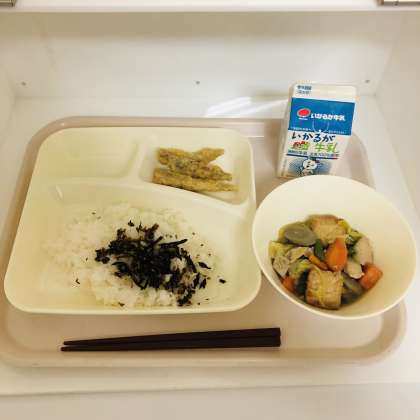 今日の献立は、ご飯、牛乳、いわし天ぷら、あつあげと野菜の煮物、ごまひじきでした。