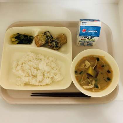 今日の献立は、ご飯、牛乳、さばのカレーたつた揚げ、さつまいもとうすあげのみそ汁、白菜とほうれん草の煮びたしでした。