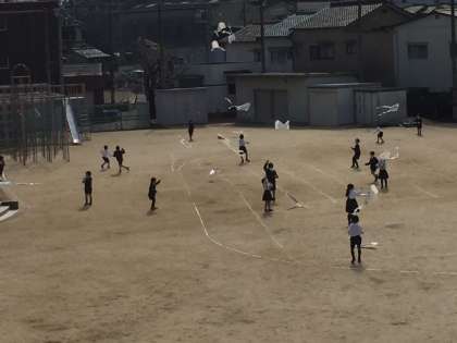 1年生は5時間目の生活科の時間に「たこあげ」をしました。20ものたこが「空高く」は行かないですが、強い風を受けてしっかり上がっていました。地を這うたこもいましたが、とても楽しそうでした。他の学年の人も窓から見ていました。あれ?授業中だよね?