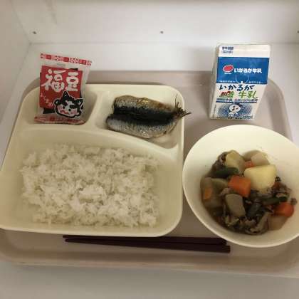 今日の献立は、ご飯、牛乳、いわしのしょうがじょうゆかけ、含め煮、いり大豆でした。