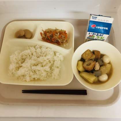 今日の献立は、ご飯、牛乳、関東煮、甘酢あえ、白花豆の煮ものでした。