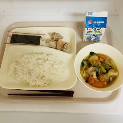 今日の献立は、ご飯、牛乳、鶏肉のから揚げ、まる天と野菜のうま煮、焼きのりでした。