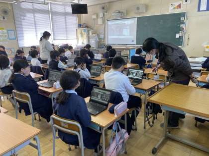 今日は4年生でタブレットを使って、校長先生とやり取りをしました。普段直にお会いしている校長先生が画面の中におられるのは、不思議な感じですね。