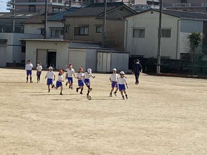 2年生の体育はサッカーです。風は少し冷たいですが、いい天気の中の体育です。動き回るにはちょうどいいです。そして、ボールを追いかけて走る姿はかっこいいですね。