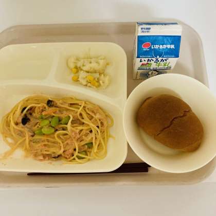 今日の献立は、黒糖パン、牛乳、さけのクリームスパゲッティ、カリフラワーとコーンのサラダでした。