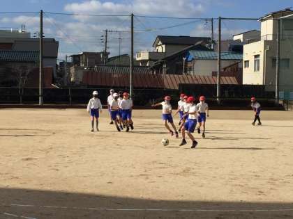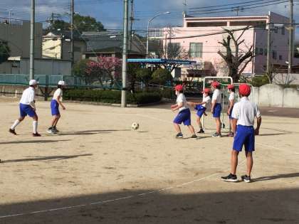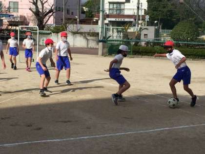 今日はとても天気が良かったです。5年生の体育の授業です。サッカーをしています。楽しんでいます。