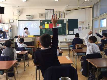 給食後、少し時間があり、急遽栄養教諭から栄養指導を行いました。3月3日(水)の給食の献立は「黒糖パン、牛乳、さけのクリームスパゲッティ、カリフラワーとコーンのサラダ」でした。特に「さけのクリームスパゲッティ」「カリフラワーとコーンのサラダ」の中に入っている栄養の基になっている食材をクイズにしました。答えたくて仕方がない子どもたちがたくさんいます。