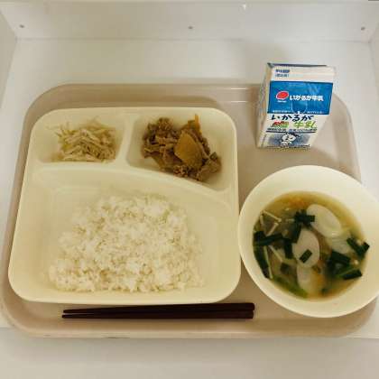 今日の献立は、ご飯、牛乳、豚肉のコチジャンいため、トック、もやしのナムルでした。