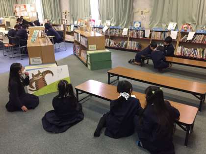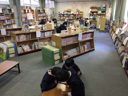 今日は雨で運動場で遊ぶことができません。2時間目の後の15分休憩の図書館の様子です。毎日、図書委員会の児童が15分休憩に仕事をしてくれるのですが、今日は特に来館児童が多いです。折り紙の本を見ながら折り紙を折る児童、お友達に読み聞かせをする児童、なぞなぞを出し合う児童と様々な時間を過ごしています。