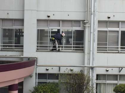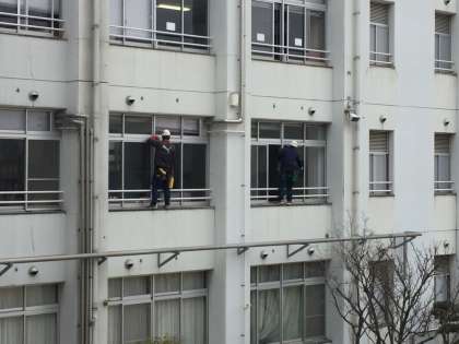 学校には先生や地域の方以外に、いろんな場面で関わってくださる方々がいます。今日は、児童のみなさんでは掃除のできない、高い所や、運動場や43号線側の窓の清掃をして下さっています。危険な場所ですが、きれいにしてくださっています。ありがとうございます。