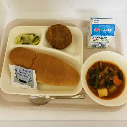 今日の献立は、コッペパン、牛乳、チキンレバーカツ、ケチャップ煮、キャベツときゅうりのサラダ、ブルーベリージャムでした。