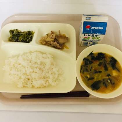 今日の献立は、ご飯、牛乳、豚肉のしょうが焼き、みそ汁、じゃこピーマンでした。