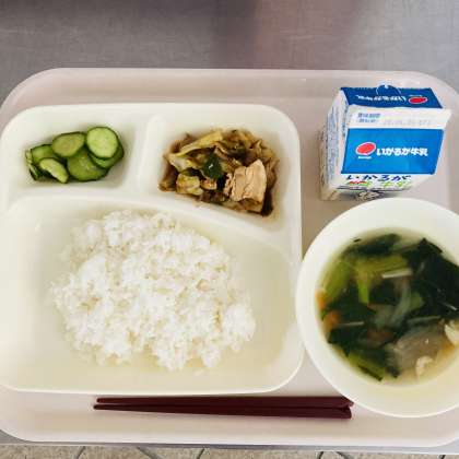 今日の献立は、ご飯、牛乳、ホイコウロー、中華スープ、きゅうりのピリ辛あえでした。