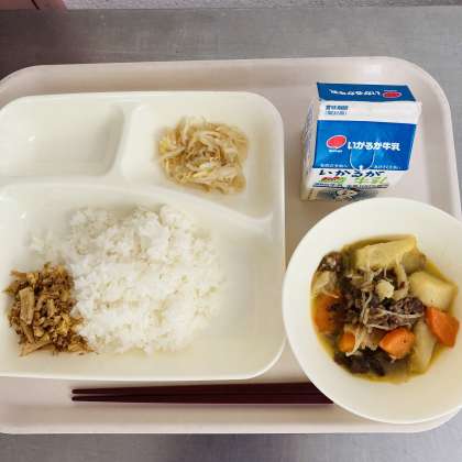 今日の献立は、ご飯、牛乳、肉じゃが、もやしのゆずの香あえ、ごまかかいためでした。
