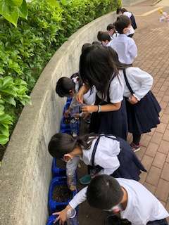 生活科の学習の様子です。あさがおの種を昨日まき、今日は追肥をまいて水やりをしました。早く芽が出ないか楽しみです。