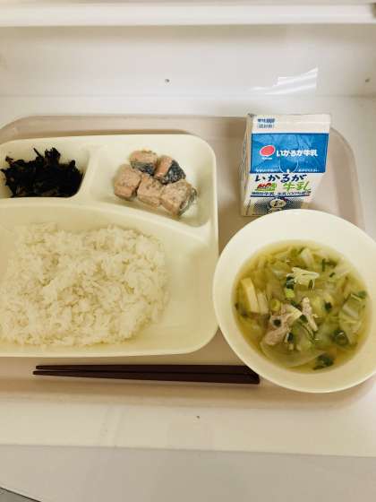 今日の献立は、ご飯、牛乳、さけのごまみそ焼き、五目汁、ひじきのいため煮でした。