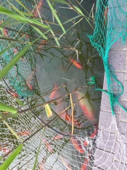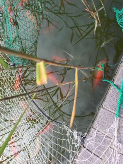 福小学校では正門入ってすぐに池があります。そこには金魚や鯉が泳いでいます。朝、ごはんを食べている最中の金魚や鯉です。この子たちも元気にしています。ごはんをくれる人が近づいたら口をパクパクさせて寄ってきます。一年生は珍しいのか、体を乗り出して覗き込んでいました。