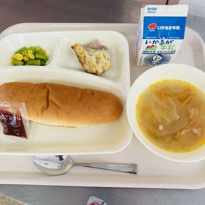 今日の献立は、コッペパン、牛乳、かつおのガーリックマヨネーズ焼き、ベーコンと野菜のスープ、グリーンアスパラガスのソテー、いちごジャムでした。