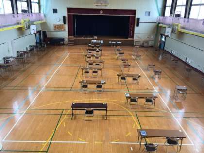 お家の事情で10時15分から30分までに登校できないお子様につきましては、8時30分から10時30分まで講堂でお預かりしています。図書室にてお預かりしていましたが、スペースの都合上、密を避けることから、現在は講堂でお預かりしています。子どもたちが頑張っているなぁ、と思うのは、来ている子どもたちはプリント学習への取組や、教員が準備したビデオなどをしゃべらず観たり、読書をしたり、真剣に取り組んだりしています。