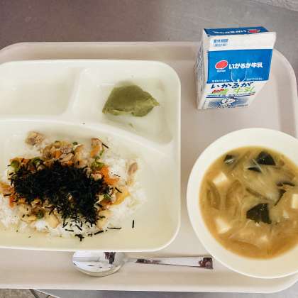 今日の献立は、牛乳、かやくごはん、みそ汁、抹茶ういろうでした。