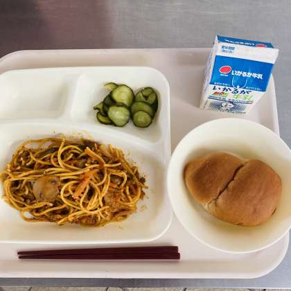 今日の献立は、黒糖パン、スパゲッティミートソース、きゅうりのピクルスでした。