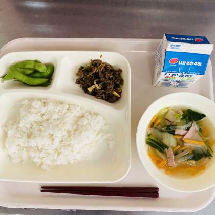 今日の献立は、ご飯、牛乳、チンジャオニューロウスー、ハムと野菜の中華スープ、枝豆でした。「