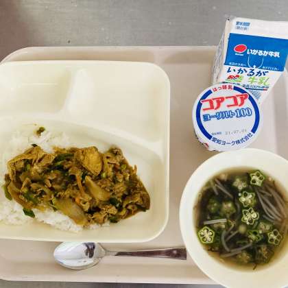 今日の献立は、牛乳、和風カレーどんぶり、もずくとオクラのとろり汁、ヨーグルトでした。