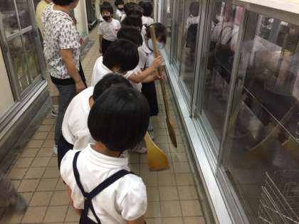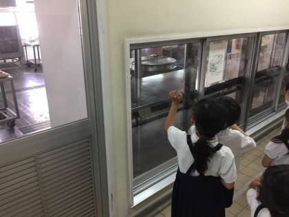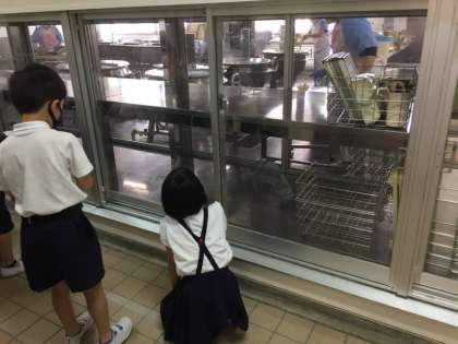 1年生は3時間目に生活科の授業で給食室の中を見学しました。調理員さんが今日の給食を作っているところを見せていただきました。福小学校全員の給食を作っている場面を見たり、実際に使っている道具を見て、びっくりしていました。大変な作業をして、おいしい給食を作ってくださっていることに、感謝の気持ちを伝えました。給食室から出るときにひとりひとりが調理員さんに声をかけて、手を振っている姿を見て、調理員さんも「かわいい!」と喜んでおられました。