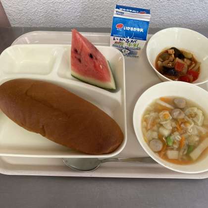 今日の献立は、黒糖パン、牛乳、鶏肉と夏野菜のソテー、押麦のスープ、すいかでした。