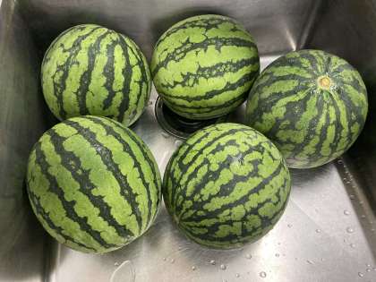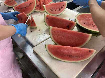 デザートのすいかは、中心から放射線状に切ることで、甘さが均等に行き渡るようにしています。
