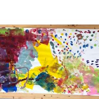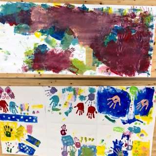 1年生の図工の学習「ころころ ぺったん」の作品です。大きな画用紙に、ローラー、凸凹したダンボールや梱包用のプチプチなどに絵の具をつけて、ころころぬり、ぺったんぺったんスタンプして表現しました。最後は自分の手に絵の具を付けて、ぺったんしてしまう子も…。