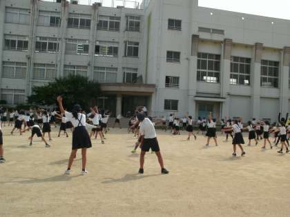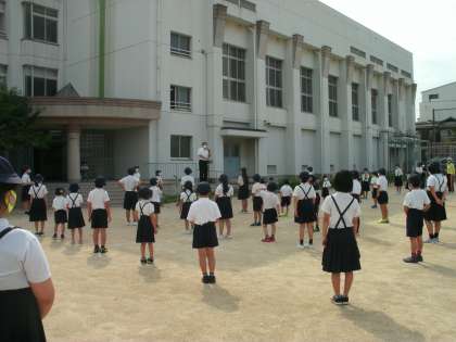校長先生の話の後、運動委員会が前に出て、ラジオ体操を行いました。ラジオ体操を一生懸命すると汗をかきます。運動不足を感じる人は、いかかがでしょう?夏休みにもPTAと福地域主催の「夏休みラジオ体操」が行われます。