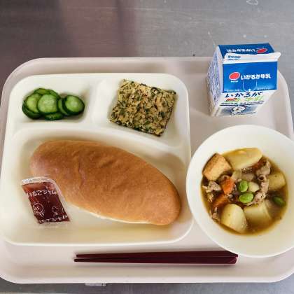 今日の献立は、コッペパン、牛乳、もずく入りヒラヤーチー、豚肉とあつあげの煮物、あっさりきゅうり、いちごジャムでした。