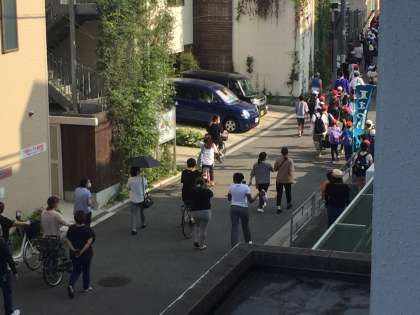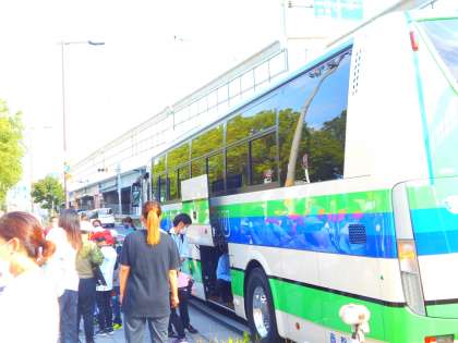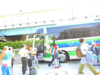 郵便局横にバスが到着しました。11時40分にハチ高原に到着予定です。朝早くから、たくさんのお家の方がお見送りに来てくださいました。ケガや病気のないよう、気を付けていってらっしゃい。楽しいみやげ話を期待しています。