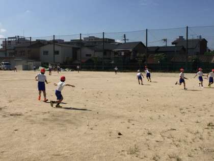 授業の様子です。3年生の体育の時間、バトンパスの練習をしています。もう一枚は2年生の図画工作の時間。夏休みの思い出を粘土で表現し、作品の説明をを友だちの前でしています。