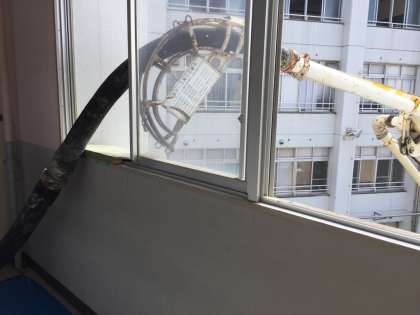 運動場ではたくさんの作業者、ミキサー車が来ています。大きなホースで流し込んでいます。工事業者さんや警備員さんに、子どもの安全や安心をお願いしています。