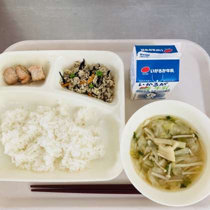今日の献立は、ご飯、牛乳、さけのしょうゆ風味焼き、五目汁、高野豆腐のいり煮でした。