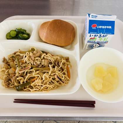今日の献立は、黒糖パン、牛乳、焼きそば、きゅうりのしょうがづけ、パインアップル缶でした。