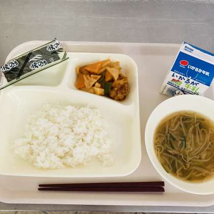 今日の献立は、ご飯、牛乳、酢豚、中華みそスープ、焼きのりでした。