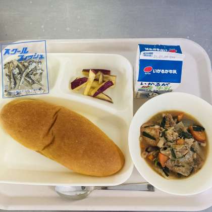 今日の献立は、パンプキンパン、牛乳、豚肉といかの中華煮、大学いも、ミニフィッシュでした。