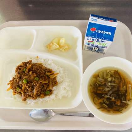 今日の献立は、牛乳、タコライス、もずくのスープ、焼きじゃがでした。