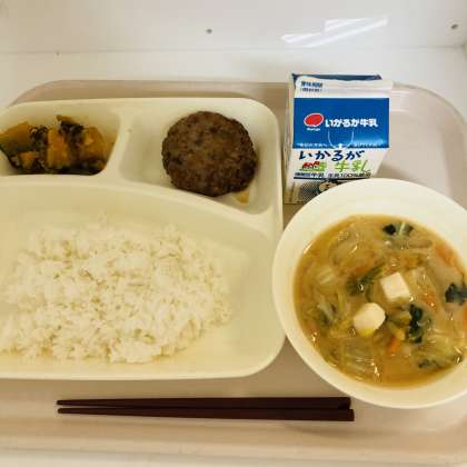 今日の献立は、ご飯、牛乳、和風ハンバーグ、とうふのみそ汁、かぼちゃのいとこ煮でした。
